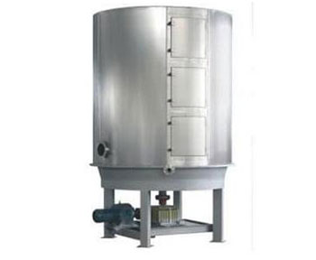 湿物料自加料器连续地加到干燥器上部第一层干燥盘上,带有耙叶的耙臂作回转运动使耙臂作回转运动使耙叶连续地翻抄物料。物料沿指数螺旋线流过干燥盘表面,在小干燥盘上的物料被移送到外缘,并在外缘落到下方的大干燥盘外缘,在大干盘上物料向里移动并从中间落料口落如下一层小干燥盘中。大小干燥盘上下交替排列,物料得以连续地流过整个干燥器。中空的干燥盘内通入加热介质,加热介质形式有饱和蒸汽、热水和导热油,加热介质由干燥盘的一端进入,从另一端导出。已干物料从后一层干燥盘落到壳体的底层,后被耙叶移送到出料口排出。湿份从物料中逸出,由设在顶盖上的排湿口排出,真空型盘式干燥器的湿气由设在顶盖上的真空泵口排出。从底层排出的干物料可直接包装。通过配加翅片加热器、溶剂回收冷凝器、袋式除尘器、干料返混机构、引风机等辅机,可提高其干燥的生产能力,干燥膏糊状和热敏性物 料,可方便地回收溶剂,并能进行热解和反应操作。